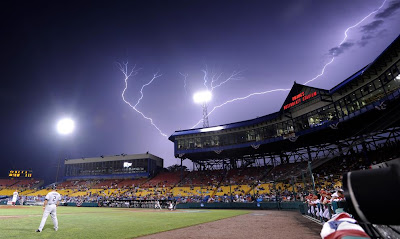 Lightning bolts light the sky above Rosenblatt Stadium where South Carolina plays Oklahoma in an NCAA College World Series baseball game in Omaha, Nebraska on Sunday, June 20, 2010. (AP Photo/Eric Francis)See more incredible weather photos here - you won't be disappointed, I promise!