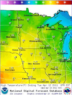 What a wild weekend of weather we had! Our first real round of showers and thunderstorms moved through overnight Saturday across the southern two-thirds of the and we managed to sneak up to 76 muggy degrees, officially at the MSP airport on Sunday, which qualifies as the warmest day of the 2011 year so far and the warmest day since since October 11th, nearly 6 months ago. Thankfully, the Metro missed the severe weather, but I fear it'll be an active Spring for us!